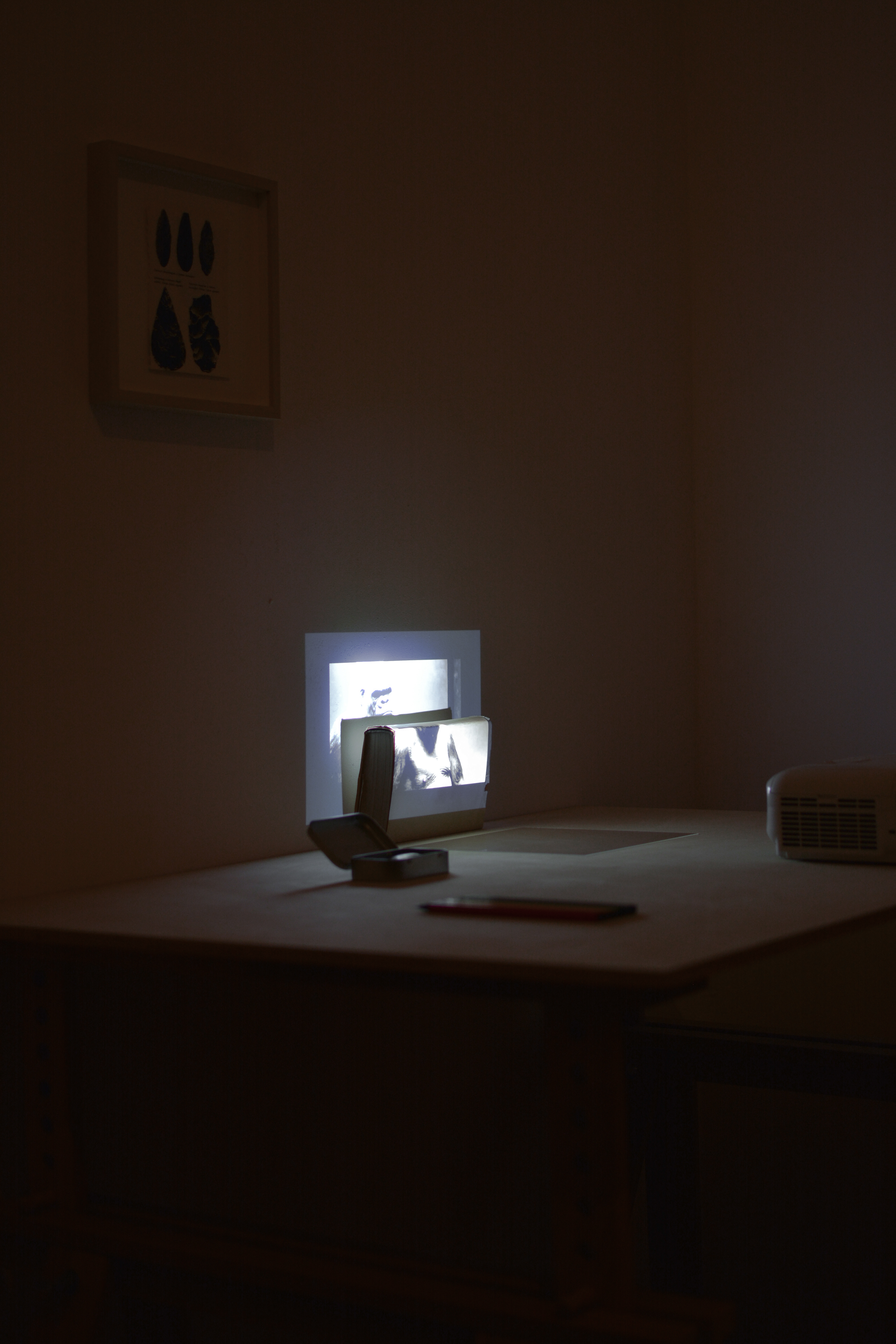 An installation: video, a book, plastic sheet, coloured pencils, pebble stones and acorn in tin box, framed page of a book; 110 x 170 x 75 centimetres; 2019.