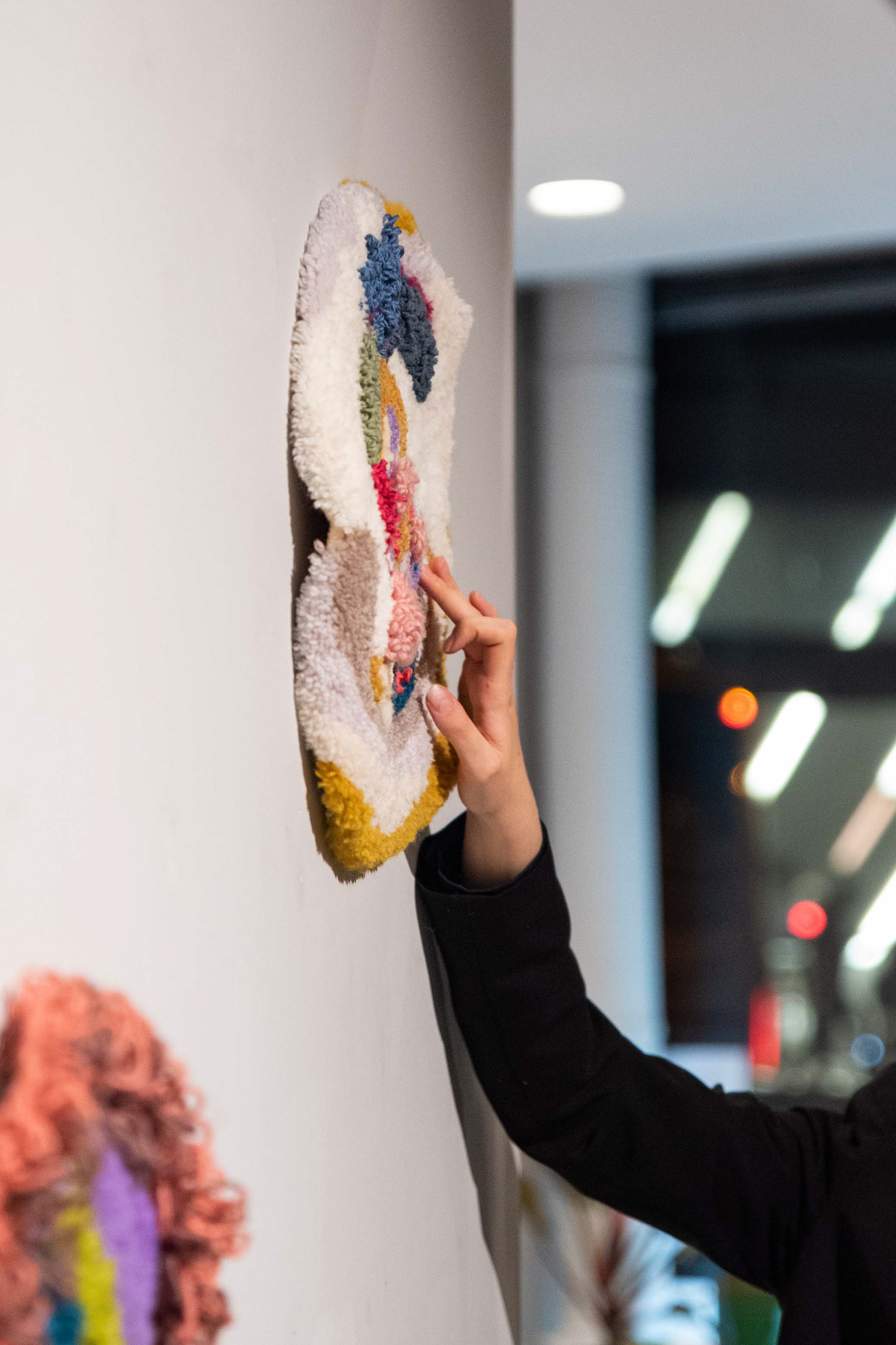 (hand tufting, punching, mixed wool and acrylic secondhand yarns 40×40cm, 2023.)